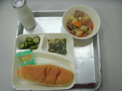 今日の給食は、もずく入りヒラヤーチー、豚肉といかの煮物、あっさりきゅうり、コッペパン、リンゴジャム、牛乳です。