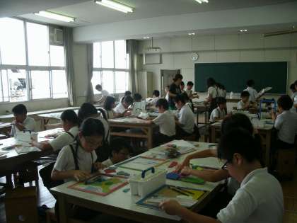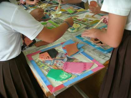5年生は、図工室で木工作品の仕上げをしていました。かわいいパズルや迷路ができあがっていきました。