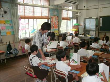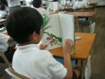 1年1組は、「おおきなかぶ」の音読をしていました。担任の先生の後に続いて大きな声ではきはきと読んでいました。