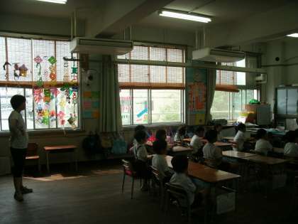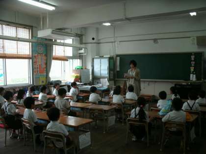 1年1組は、日記タイムでした。子どもたちが書いている日記を担任の先生が紹介していました。先生に日記を紹介してもらった子どもたちは、照れくさそうにしながらも、とてもうれしそうな笑顔になっていました。