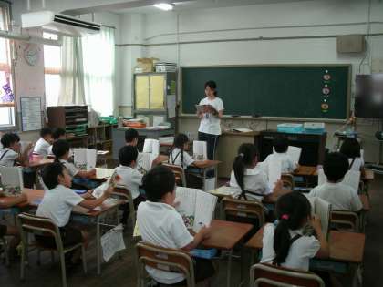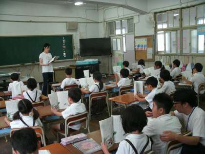 1年2組は、国語の「おおきなかぶ」を学習していました。担任の先生の音読に続いて追いかけ読みをしていました。とてもはっきりとした声で上手に音読していました。
