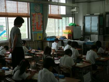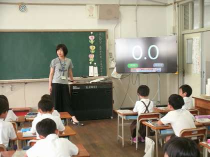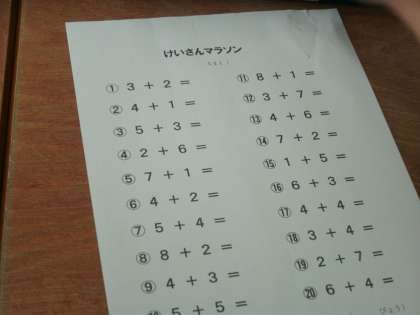 1年1組は、算数の学習をしています。フラッシュカードをみてすぐに答える練習をした後、「計算マラソン」のプリントで計算問題を速く、正確に解く練習をしていました。
