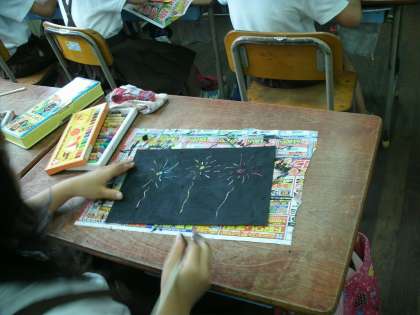 2年2組は、図工をしていました。前回の続きで、黒いパスでぬった部分をけずると下からきれいな色が出てきます。手を黒くしながらも、きれいな花火ができるとうれしそうに、削る作業に集中していました。