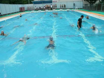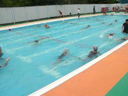 5年生と6年生は、プール水泳をしていました。平泳ぎの練習をしていました。25mで折り返し、75mを目標に泳いでいました。