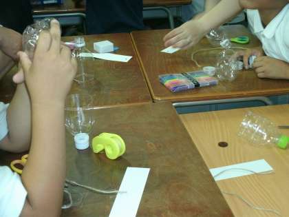 3時間目は、学年ごとにふれあい活動を行いました。1・2年生は紙コップを使った「ぴょんぴょんウサギ」、3・4年生はペットボトルを使った「風鈴」、5・6年生は割り箸を使った「円ばん発射機」です。