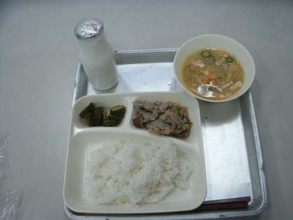 今日の給食は、豚肉とピーマンのしょうが焼き、とうがんのみそ汁、きゅうりのピリ辛あえ、ごはん、牛乳です。