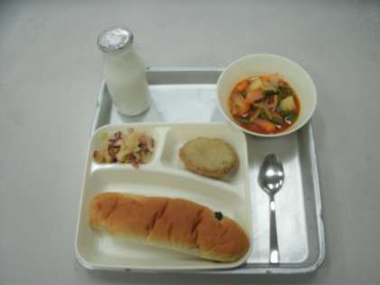 今日の給食は、チキンレバーカツ、ケチャップ煮、たことキャベツのソテー、レーズンパン、牛乳です。