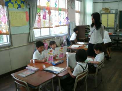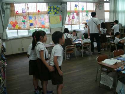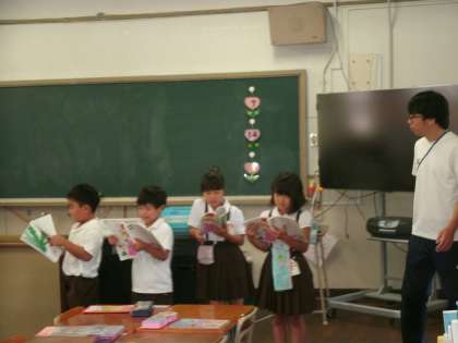 1年2組は、国語の学習をしていました。「おおきなかぶ」の音読発表会にむけて、班ごとに練習中です。かぶを抜く動作を入れる班や役割分担をして読む班などいろいろな工夫をしています。