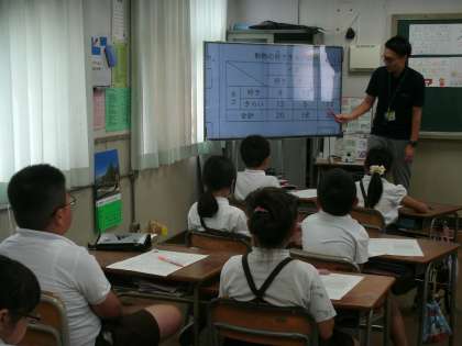 4年1組は、算数の学習をしていました。表のデータと比べながら、好きなのは「犬」[猫」「どちらとも」などを挙手で調べていました。