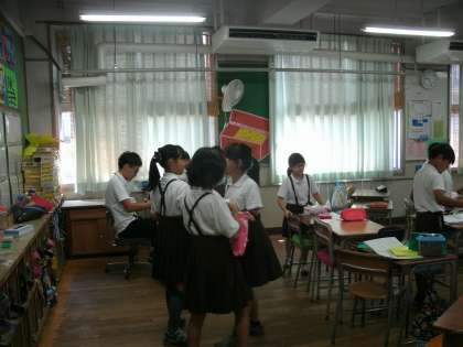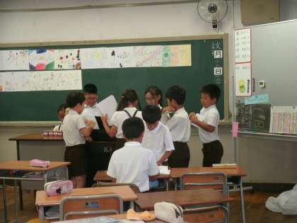 4年1組は、1学期しめくくり会の準備をしていました。黒板には、楽しそうな内容のプログラムが掲示してありました。