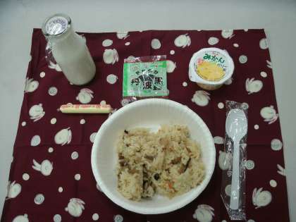 今日の給食は、かやくごはん、みかんゼリー、ソフト黒豆、棒チーズ、牛乳です。