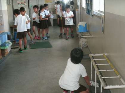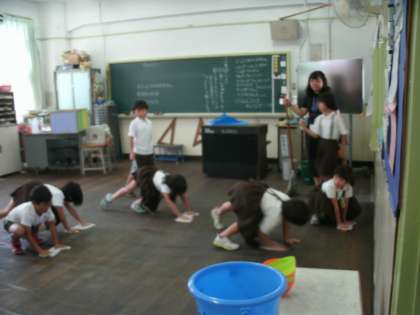 2年2組は、教室ピカピカ大作戦をしていました。教室や廊下をみんなで協力してピカピカに清掃しています。