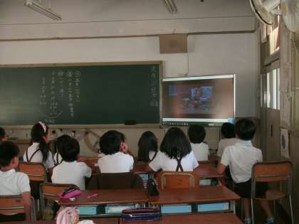 4年2組は、ビデオ視聴をしていました。教室の後方では、担任の先生が、ひとりひとりに通知表を渡していました。がんばったことの成果を伝えられ、笑顔がほころんでいました。