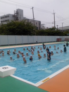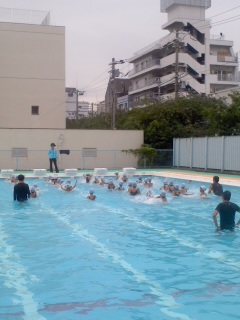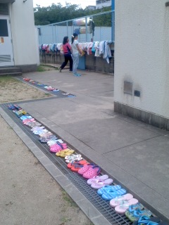 本日から28日まで夏季水泳指導が始まりました。1、2年生の水泳指導の様子です。入口に脱がれたサンダルはとてもきれいにそろっていました。