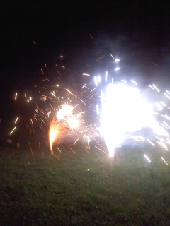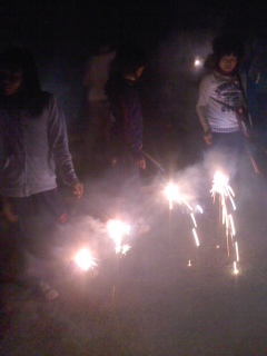 キャンプファイヤー場まで歩き、花火を楽しみました。手持ち花火や吹上花火、打ち上げ花火で盛り上がりました。