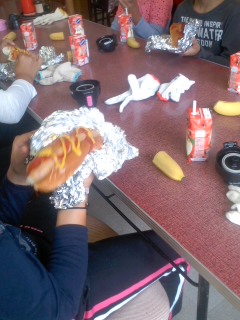 ホカホカのカートンドッグの出来上がり。りんごジュースとバナナもついています。