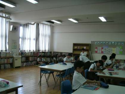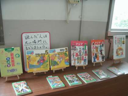 右側の写真は、4年生の教室前の廊下に設けられている読書コーナーです。