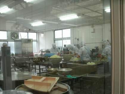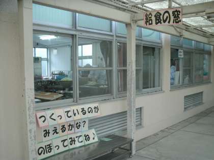 窓の前には台が設置されています。背の低い低学年でも給食室の中の様子をしっかりと観察することができます。