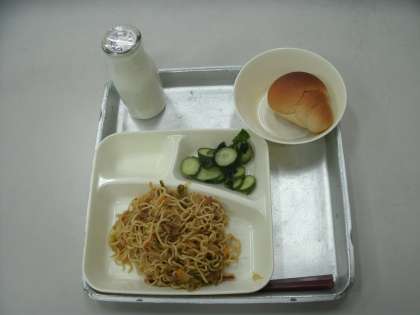 今日の給食は、焼きそば、きゅうりとわかめの中華あえ、黒糖クレセントロールパン、牛乳です。