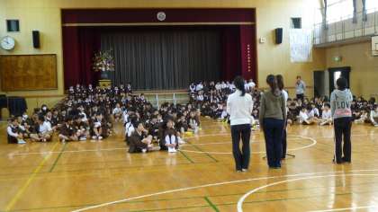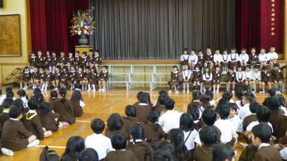 今日の2時間目、講堂で「1年生を迎える会」が行われました。この会は、1年生に学校の一員になったことを理解させ、学校生活に対する希望や期待を持たせるようにするため、毎年この時期に行っています。