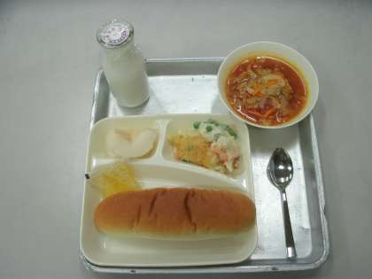 今日の給食は、えびグラタン、トマトのスープ、なし(二十世紀)、コッペパン、マーマレード、牛乳です。