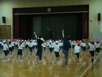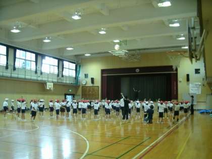 昨日から始まった運動会の練習。1時間目には体育館で1・2年生が団体演技の練習をしていました。