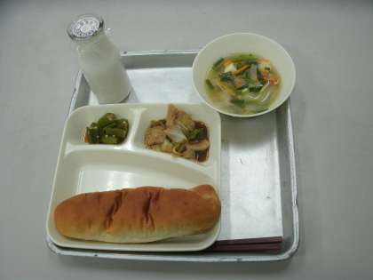 今日の給食は、ホイコウロー、とうふのスープ、オクラの中華あえ、レーズンパン、牛乳です。