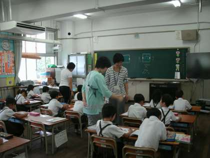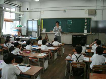 1年1組は、国語の学習をしていました。音読練習をした後、漢字の練習をしていました。「六」と「七」を練習しています。