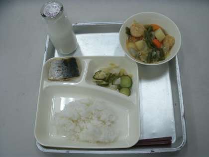 今日の給食は、さごしの塩焼き、じゃがいもと一口がんもの煮物、キャベツときゅうりのゆずの香あえ、ごはん、牛乳です。