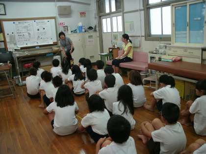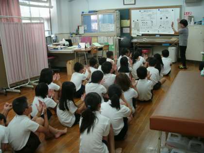 4年2組の保健指導の様子です。「つめはのびすぎていないか」確認しているところです。