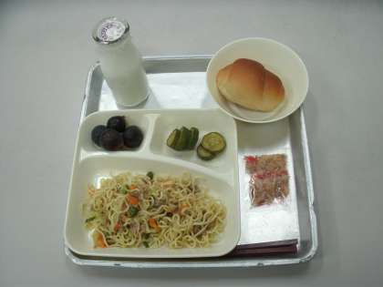 今日の給食は、和風焼きそば、きゅうりの辛みづけ、ぶどう(巨峰)、黒糖クレセントロールパン、牛乳です。