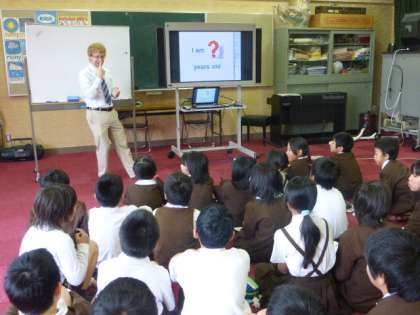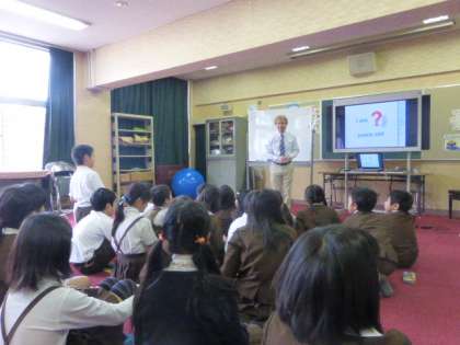 5年生は、C-NETのニール先生にお越しいただき、外国語活動の学習をしました。先生の年齢をあてているところです。