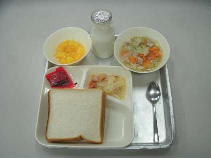今日の給食は、鶏肉とてぼ豆のスープ煮、じゃがいもとトマトのチーズ焼き、黄桃(カット缶)、食パン、いちごジャム、牛乳です。