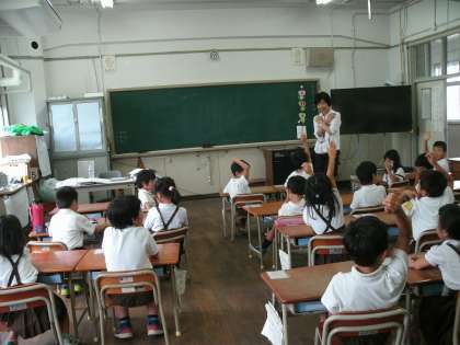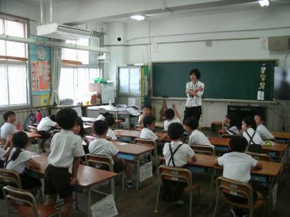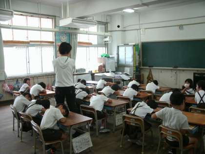 1年1組は、道徳の学習をしていました。友達の背中をやさしくなでながら温かい言葉がけをしていました。その後の気持ちを発表していました。「やさしくなでてもらったら、なんだかうっとり、眠りたい気分になってきました。」という発言をうけて、少しだけみんなでうっとり気分を楽しんでいました。