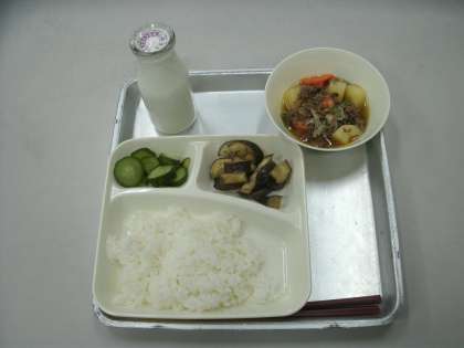 今日の給食は、肉じゃが、焼きなすのみそだれかけ、あっさりきゅうり、ごはん、牛乳です。