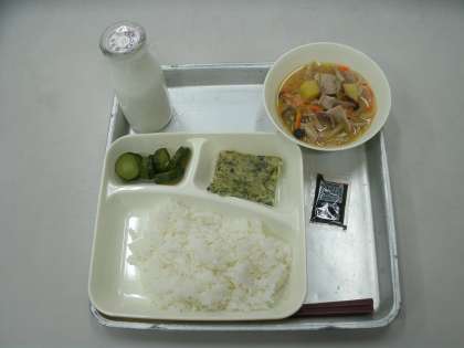 今日の給食は、お好み焼き、豚汁、きゅうりの梅風味焼き、ごはん、牛乳です。