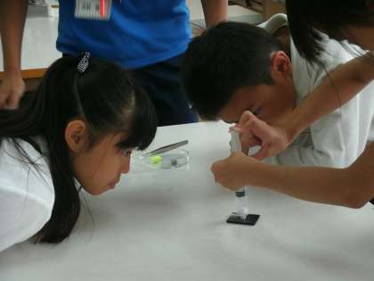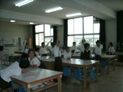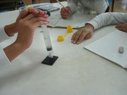 4年1組は、理科室で実験をしていました。押し縮められた空気の力を調べています。事前の予想と比べて実験の結果はどうだったでしょうか。