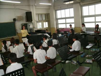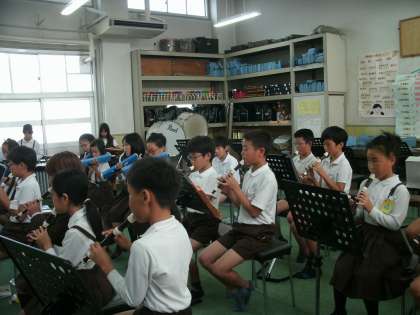 4年2組は、音楽室で合奏の練習をしていました。「茶色の小びん」を練習していました。