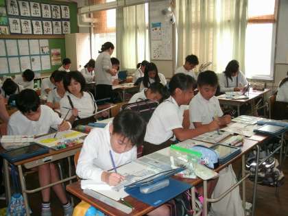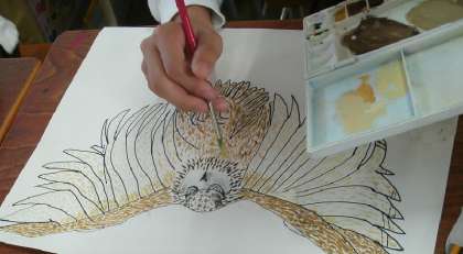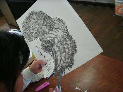 6年生は、図画工作の時間でした。羽ばたいているふくろうの絵を描いて切りとっていました。迫力のあるふくろうを描いていました。