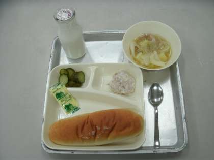 今日の給食は、鶏肉のマリネ焼き(ノンオイルドレッシング)、スープ煮、きゅうりのピクルス、コッペパン、マーガリン、牛乳です。