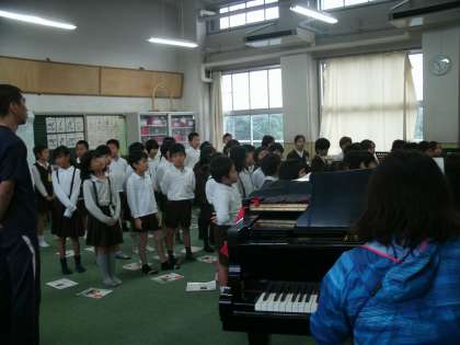 2年生は、音楽室でリズム打ちと合唱の練習をしていました。