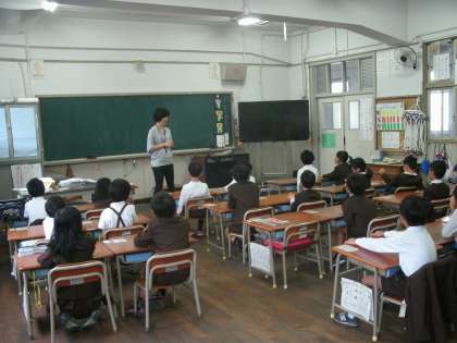 1年1組は、担任の先生が、雨の日の安全な過ごし方について話していました。お話をしっかり聞いた後は、今朝の健康調べをしました。