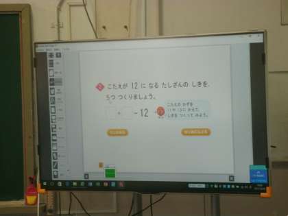 1年2組は、算数の学習をしていました。電子黒板のフラッシュカードで計算練習をした後、「答えが12になるたし算の式を5つ考えていました。
