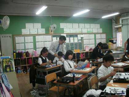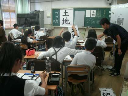 4年1組は、毛筆習字をしていました。「土地」を練習していました。