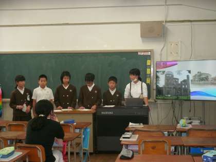 6年生は、修学旅行の宿舎で行う学習会の発表練習を、班ことにしていました。自分たちでテーマを決め、調べ学習してまとめたことを発表します。