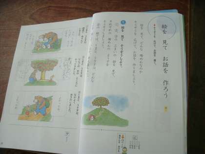 2年2組は、国語「絵を見てお話をつくろう」を学習していました。教科書の挿絵を見ながらお話を想像して考えます。それをお互いに発表し、聴きあっていました。
