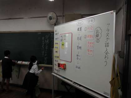 4年1組は、国語の時間に意見討論会を開きました。授業の学習ポイントを上げるには、自分たちはどうしたらいいか、というテーマをもとに「授業中に先生の話をしっかり聞くために、話をしている人がいたら話を聞くように呼びかける」など、自分たちが授業にどう取り組むべきかということを考えて意見交流をしました。