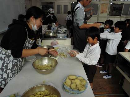 あらかじめすりつぶしておいたサツマイモをサランラップに乗せて、お団子のように丸々と手で包み込んで仕上げれば完成。子どもたちは、一人一枚サランラップをもらい、その上にサツマイモを乗せてもらい、自分好みの固さになるように茶巾絞りを作りました。