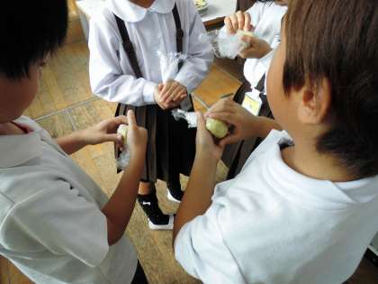 ある程度、形ができたらサランラップを外して試食。その形から「玉ねぎみたい!」「豚まんに見える」と喜んでいました。