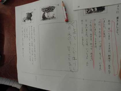2年生は今国語で、絵を見てお話を考える学習をしています。考えたことを文章に表わすことができれば、本当に役に立ちます。しっかり取り組み力をつけてほしいです。漢字の学習では、まちがった字のなおしをしていました。現代はパソコンで文章を作ることが多いですが、パソコンで文章を作るにしても正しい漢字を選ばなければなりません。正しく漢字が使えるようにこどものうちにしっかり勉強することが大切です。